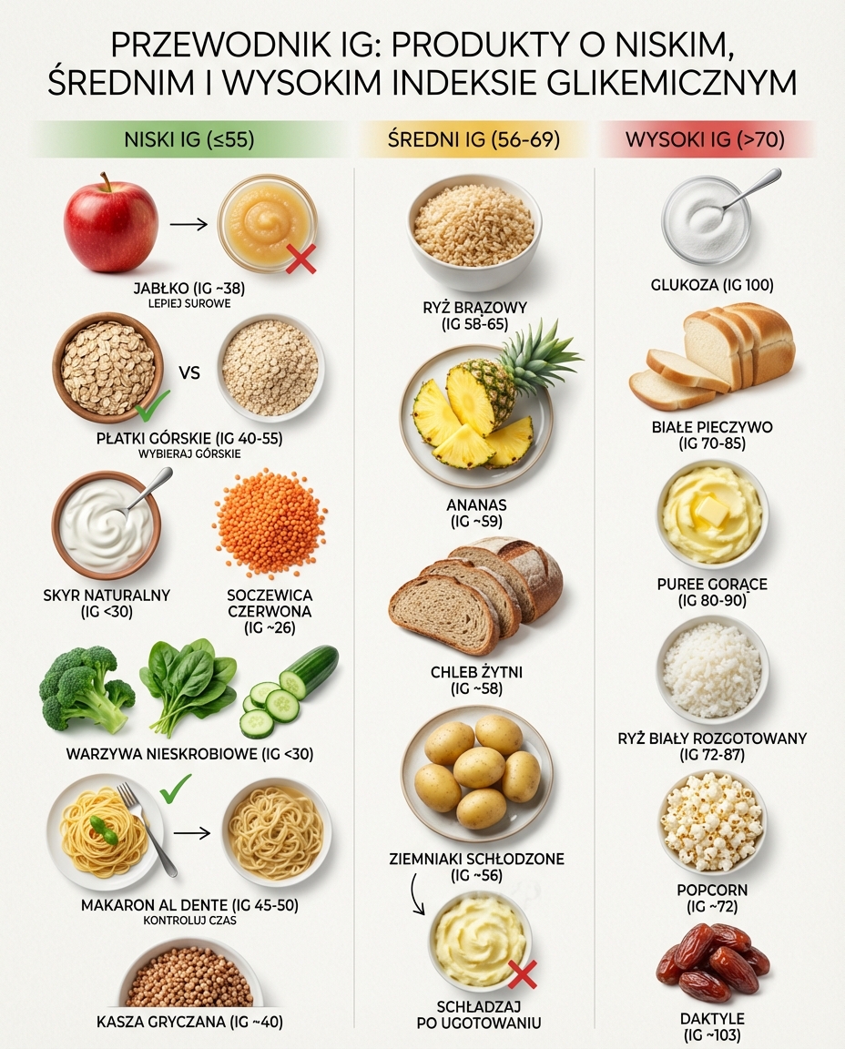 Płatki owsiane górskie mają IG w przedziale 40-55. Są dobrym wyborem na śniadanie, ale kontroluj porcję i unikaj dosładzania.